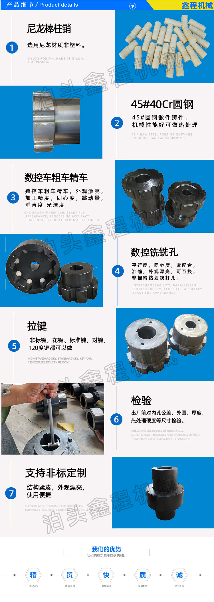 LZ型弹性柱销齿式联轴器是采用45#钢材质,数控铣加工柱销孔,可互换,尼龙棒材质为强度好尼龙6,严格按国标尺寸做,键槽拉键制成,利用若干非金属弹性材料制成的柱销,置于两半联轴器凸缘孔中,通过柱销实现两半联轴器联接.利用若干非金属弹性材料制成的柱销,置于两半联轴器与外环内表面之间的对合孔中,通过柱销来传递转矩实现两半联轴器联接,结构简单,容易制造,装拆更换弹性元件比较方便,不用移动两半联轴器。