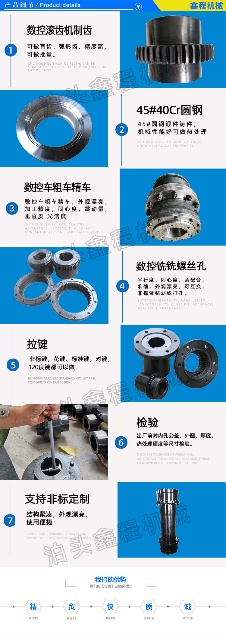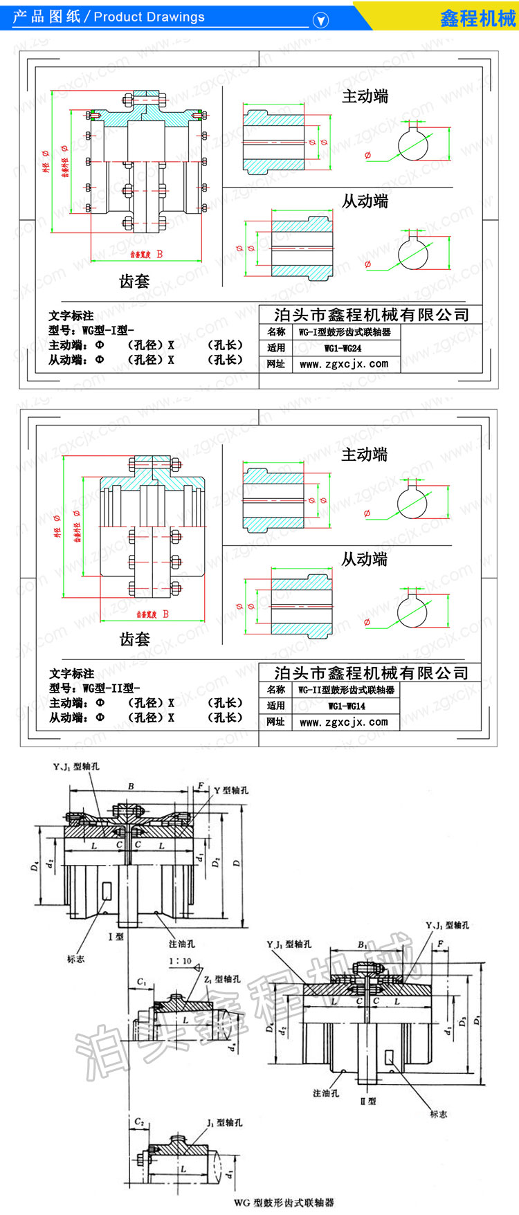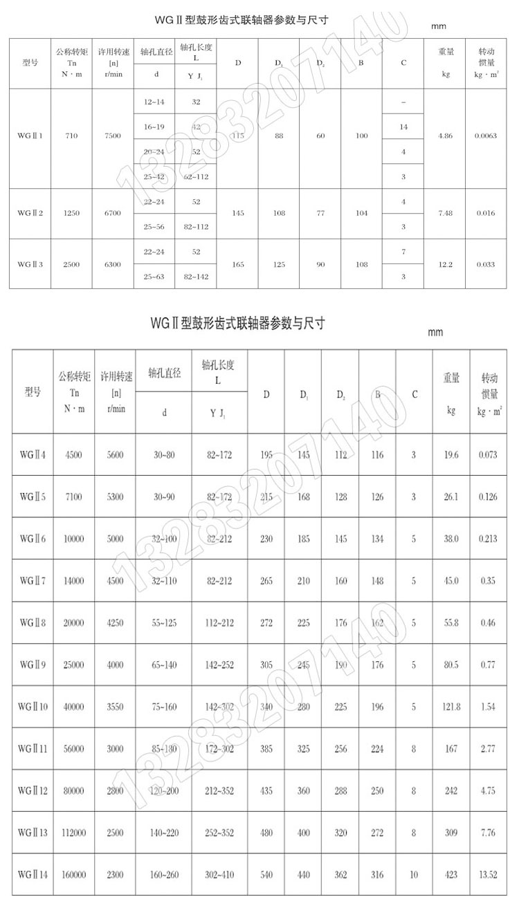 WG型鼓形齿联轴器的主要优点有:鼓形齿啮合齿面经渗碳淬火处理后,承载能力高;鼓形齿的主要失效形式是磨损,采用强制稀油润滑后,齿面磨损大幅度降低,磨损量是脂润滑的10%左右,循环稀油可带走轧辊端的轧制热量及轮齿摩擦产生的热量,防止轮齿材料表面许用接触应力降低;正常情况下,不会出现断齿现象,满足连续轧机工作特点的要求;该鼓形齿式联轴器能够满足轧机窜辊轧制的要求,伸缩非常方便、易清理等特点。