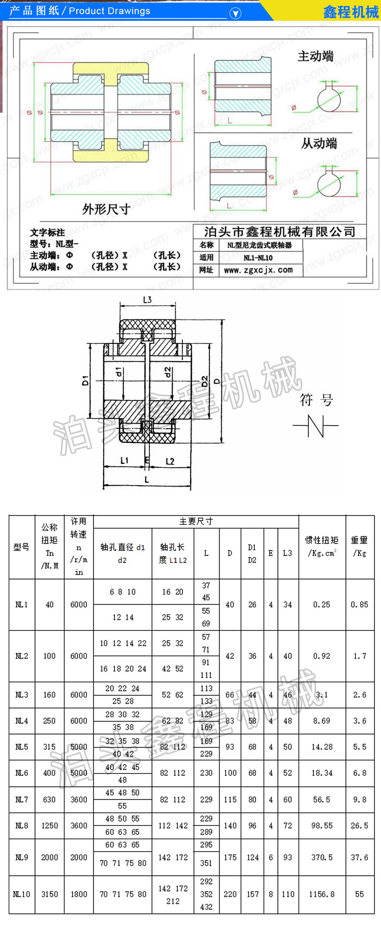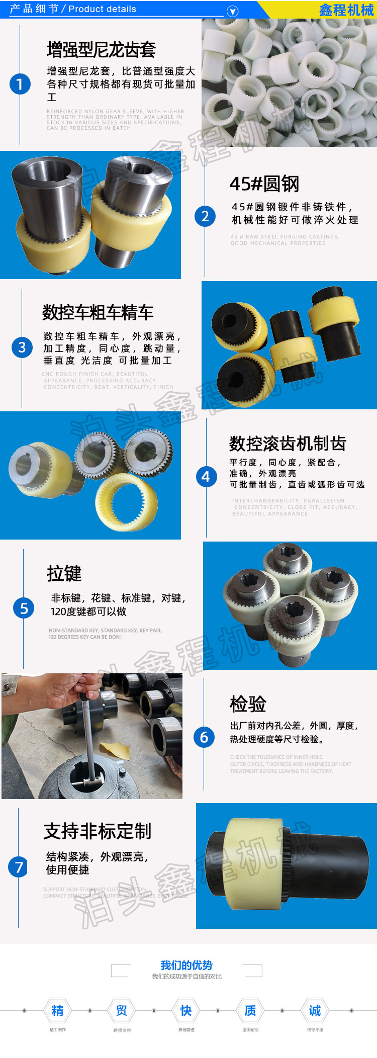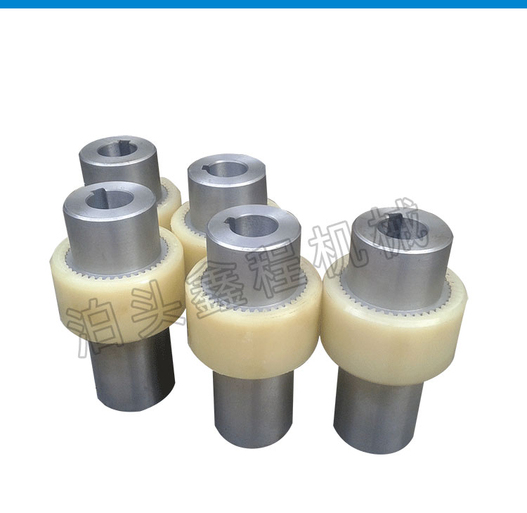 尼龙齿联轴器一般为45号钢批量加工,数控车粗车精车,数控插齿机制齿,,轴孔和键槽采用拉制成型。齿间隙可以按客户要求做大或做小,也可以按客户的尼龙齿加工,尼龙齿分为标准或增强型,不同的齿数和模数,购买时请确认型号大小齿数模数数量。尼龙齿是批量的话可以发黑处理,由于天气原因 ,联轴器容易受潮生锈,一般都做发黑处理。为满足各种机械的新改造及引进设备备件需要,我公司可以提供品种规格多样的内齿形弹性联轴器,本厂推出花键孔、锥孔、英制孔等一系列产品,并可根据用户需要接受非标准订货。弹性体外套可根据用户使用要求选用各种硬度合成尼龙、增强铸型尼龙弹性体等材料。适用于轴间及的挠性传动,允许较大的轴向径向位移和角位移,且具有结构简单、维修方便、拆装容易、噪声低、传动功效损失小、使用寿命长等优点、倍受用户欢迎。为满足各种机械的新改造及引进设备备件需要,我公司可以提供品种规格多样的尼龙内齿型联轴器,并可根据用户需要接受非标准订货。
