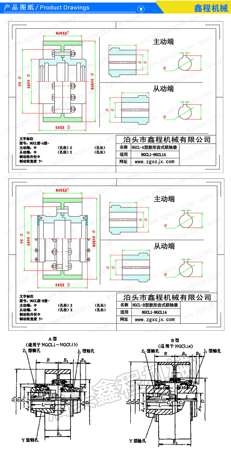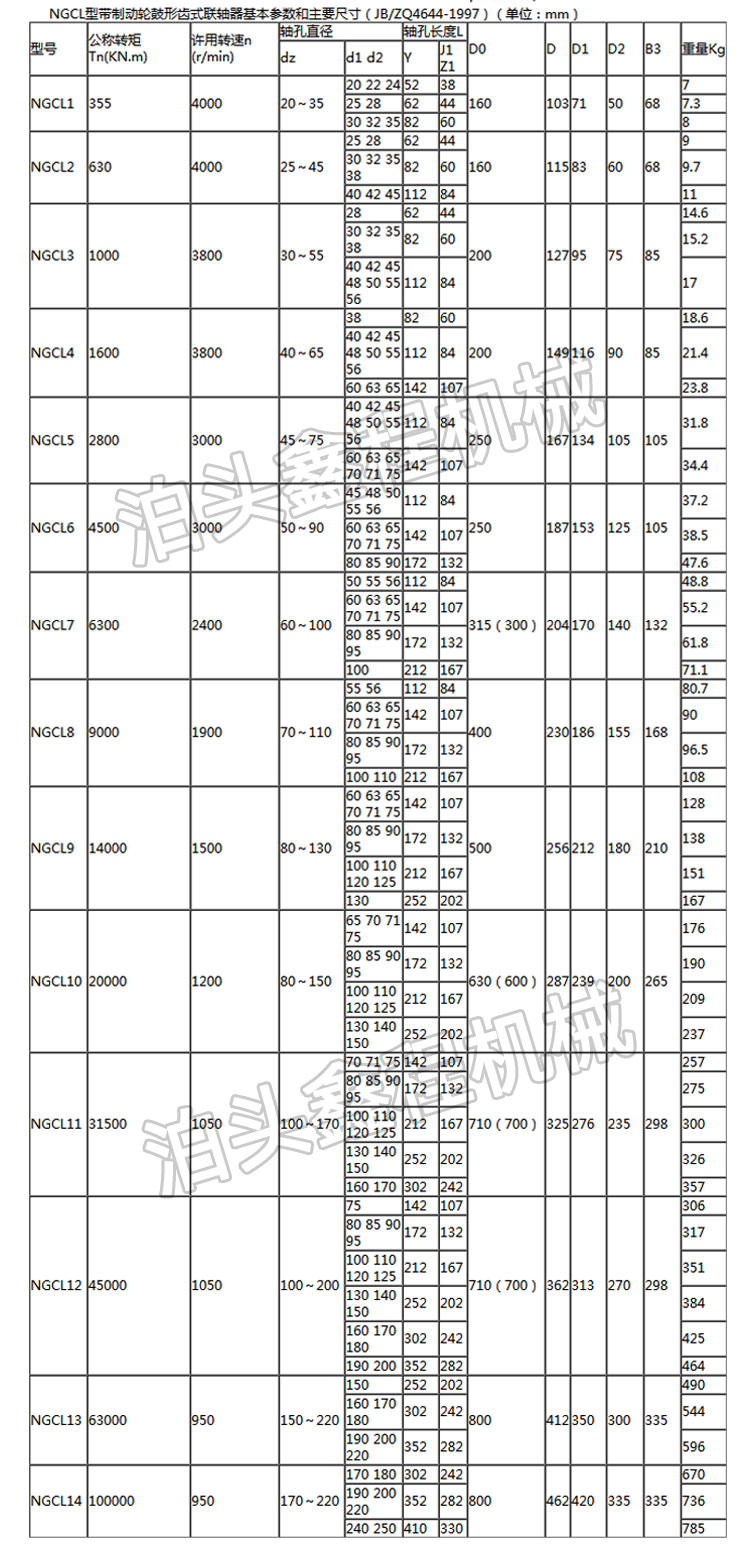 齿轮联轴器工作时,内齿圈和外齿轴套轴线的许用相对角位移△a为30’,对于CL型齿轮联轴器,被联接两轴的许用相对径向位移△△y为0.4~6.3mm;对于CLZ型齿轮联轴器,△y=Atan△a=Atan30’=0.0873A(A为中间轴两端的两外齿轴套齿宽中线之间的距离)。当采用鼓形齿时,许用相对角位移△a可达3°。