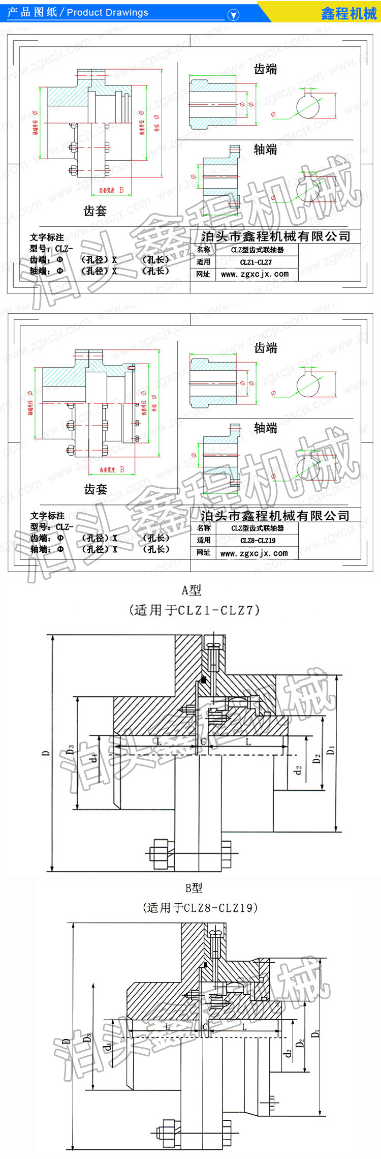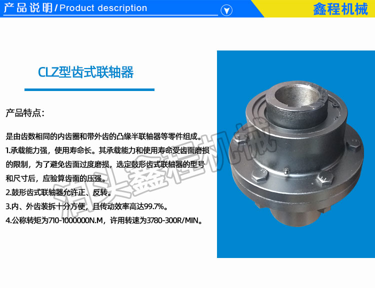 我公司生产的鼓形齿联轴器,采用45#铸钢,圆钢或锻钢,齿部高频淬火,数控滚齿机擦齿机制齿,拉床制键槽,数控车床加工轴孔,保护质量,外观光洁度高,寿命长。鼓形齿式联轴器属于刚挠性联轴器,是由齿数相同的内齿圈和带外齿的凸缘半联轴器等零件组成。外齿分为直齿和鼓形齿两种齿形,所谓鼓形齿即为将外齿制成球面,球面中心在齿轮轴线上,齿侧间隙较一般齿轮大,可允许较大的角位移,可实际效果为主齿的接触条件,提高传递转矩的能力,延长使用寿命。特别适用于低速重载工况,如冶金、矿山、起重运输等行业、也适用于石油、化工、通用机械等各类机械的轴系传动。