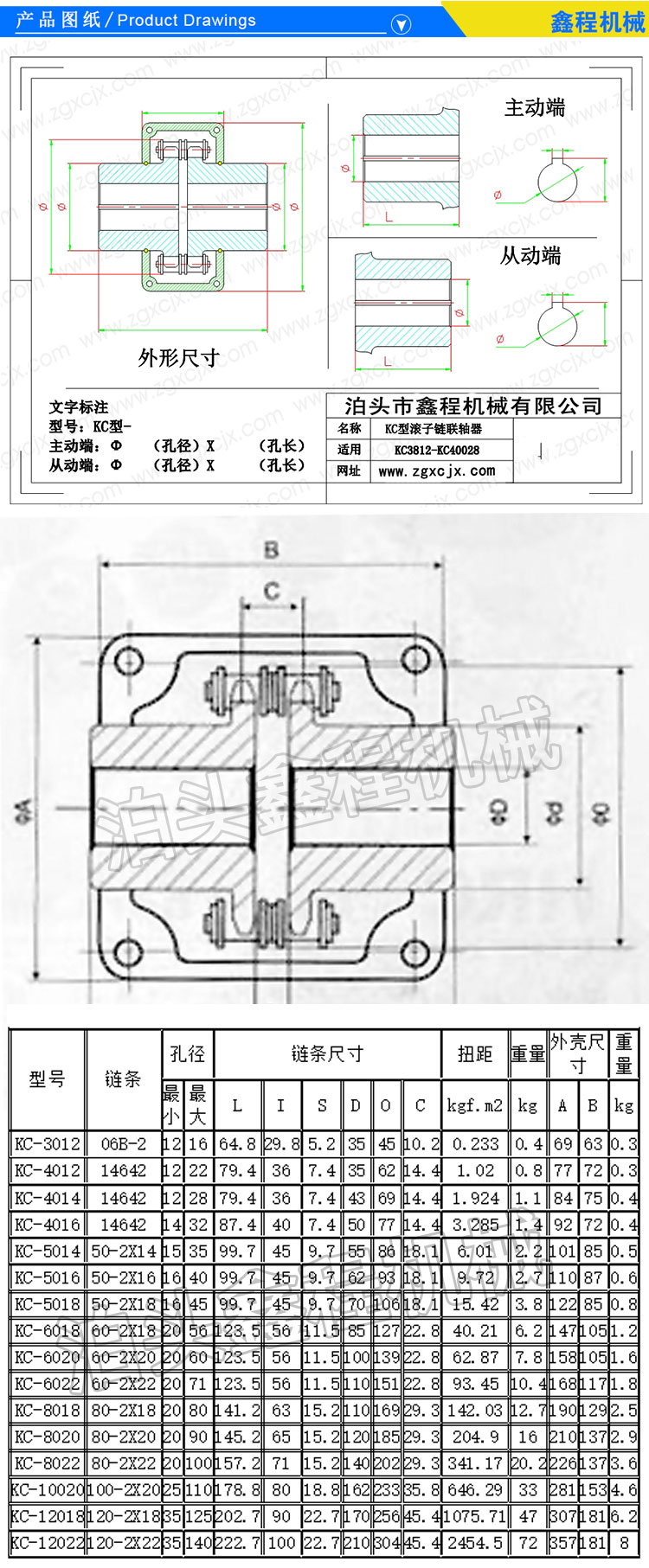 泊头市鑫程机械有限公司专注服务生产链条联轴器,双排链条,齿部高频淬火,KC/GL系列各种型号铝制罩壳,半联轴器为45#号圆钢数控车床加工,链槽拉制而成,数控铣制齿,严格依国标制造,确认精度,寿命长。 KC系列滚子链联轴器是利用公用的链条,同时与两个齿数相同的并列链轮啮合,具有结构简单、装拆方便、拆卸时不用移动被联接的两轴、尺寸紧凑、质量轻、有确定补偿能力、对安装精度要求不高、工作优良、寿命较长、成本较低等优点。