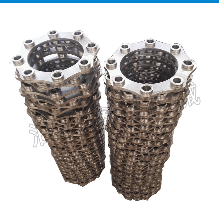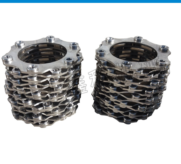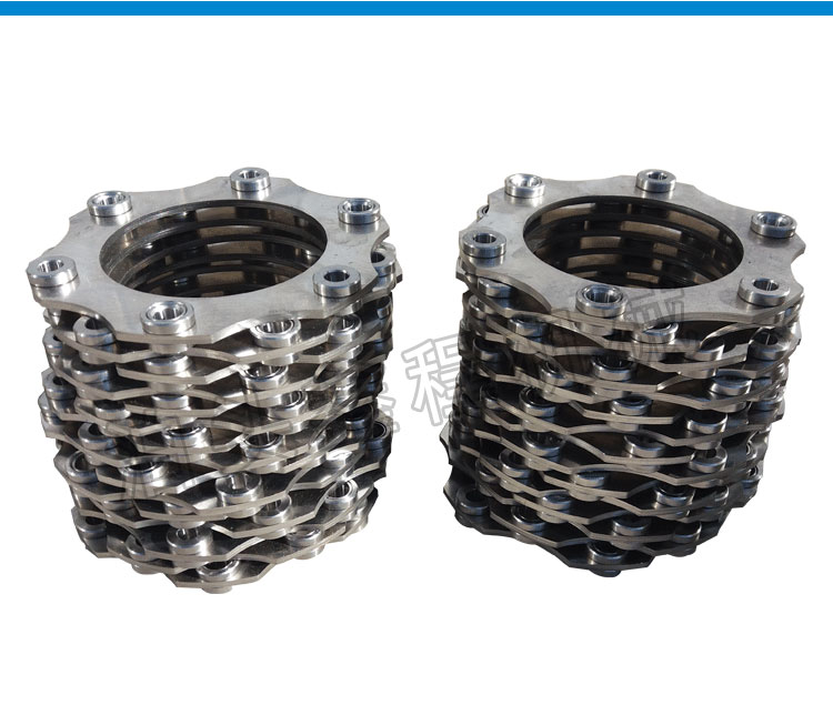 不锈钢膜片结构主要由左法兰、右法兰、金属膜片组三部分组成,左、右法兰分别为联轴器的输出端和输人端,金属膜片组为转矩传递、偏向角调整组件,联轴器的左、右法兰材料为45#钢锻件,采用 常规加工工艺可以实现,金属膜片组为整个联轴器的关键部件。