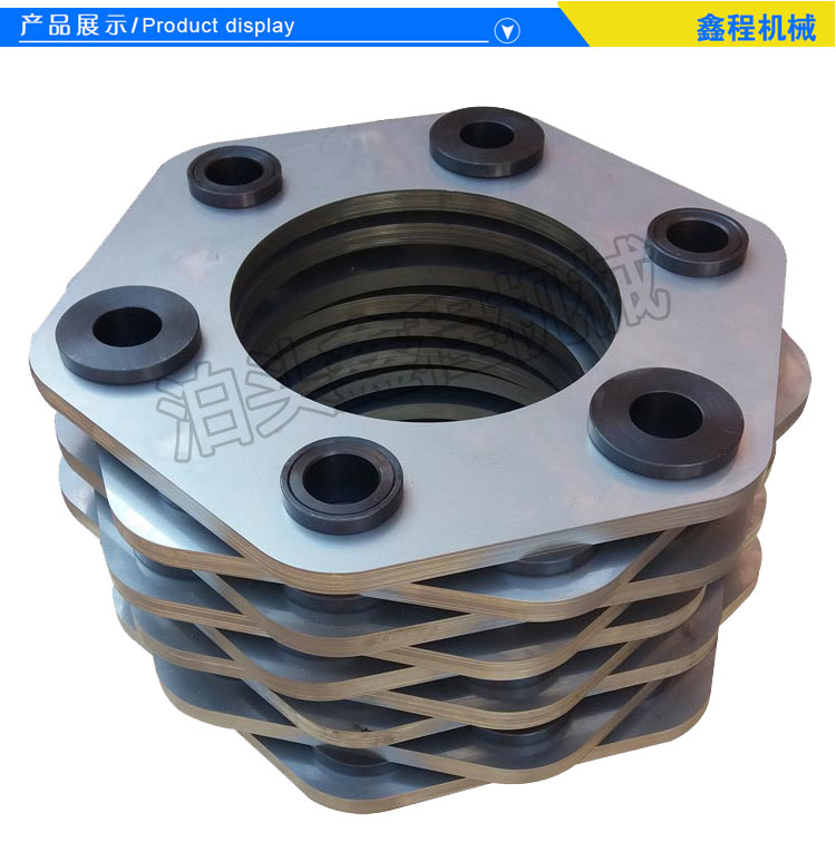 3、膜片联轴器分离连杆形特征:每一膜片由单独的薄杆组成一个多边形,杆的形状简单,制造方便,但要求各孔距准确,其工作性能与连续多边环形基本相同,但强度和转速较低,适用于膜片联轴器尺寸受限制的场合。