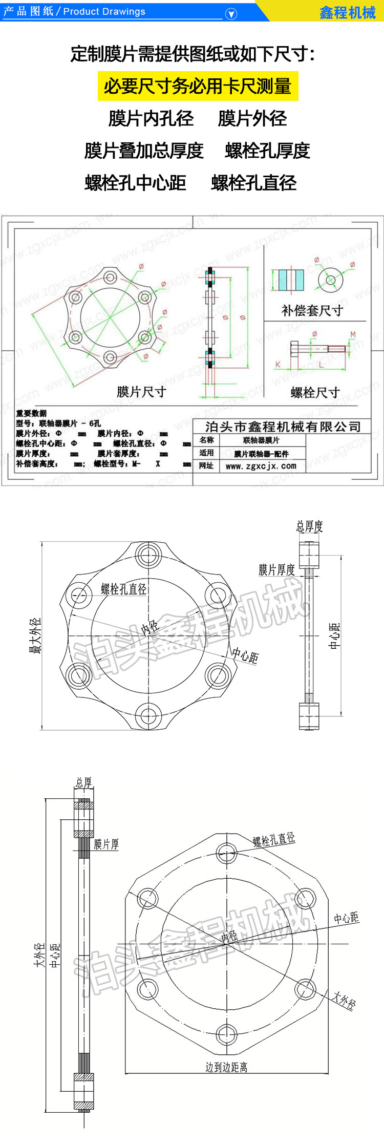 5、成型膜片联轴器膜片的特征:每一膜片联轴器由单独一个膜片构成,膜片厚度从内径向外双曲线规律减小,以保持等强度条件,其材料,整体性好,特别适用于高速传动,但膜片的制造精度较高。