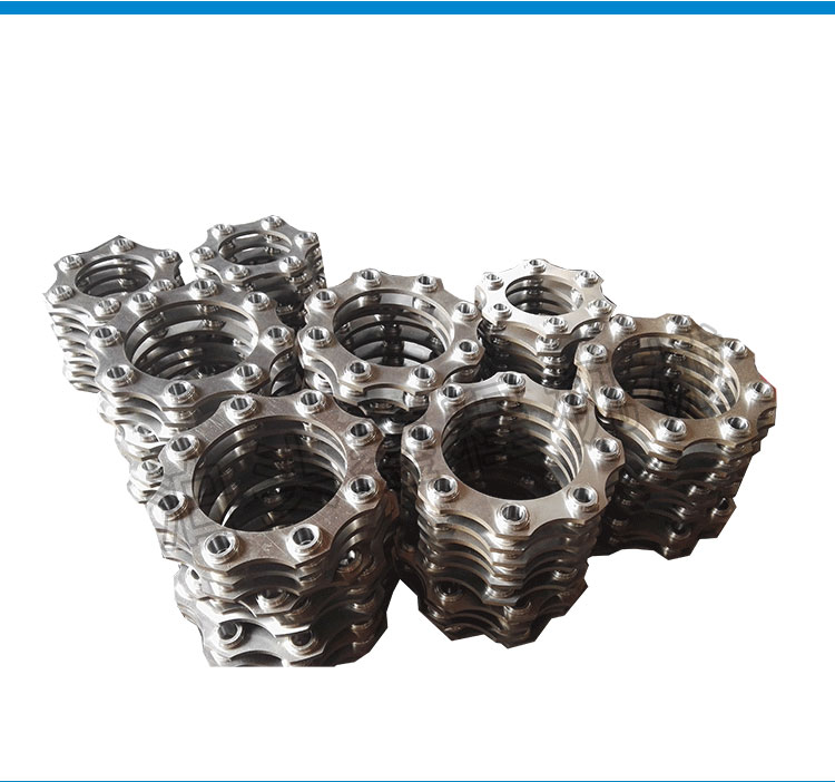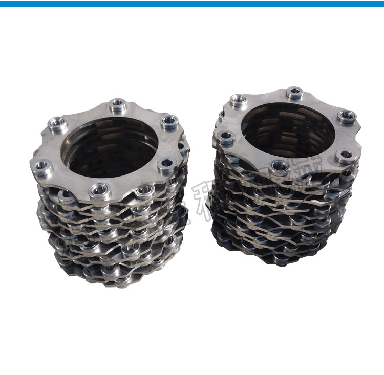 不锈钢膜片结构主要由左法兰、右法兰、金属膜片组三部分组成,左、右法兰分别为联轴器的输出端和输人端,金属膜片组为转矩传递、偏向角调整组件,联轴器的左、右法兰材料为45#钢锻件,采用 常规加工工艺可以实现,金属膜片组为整个联轴器的关键部件。