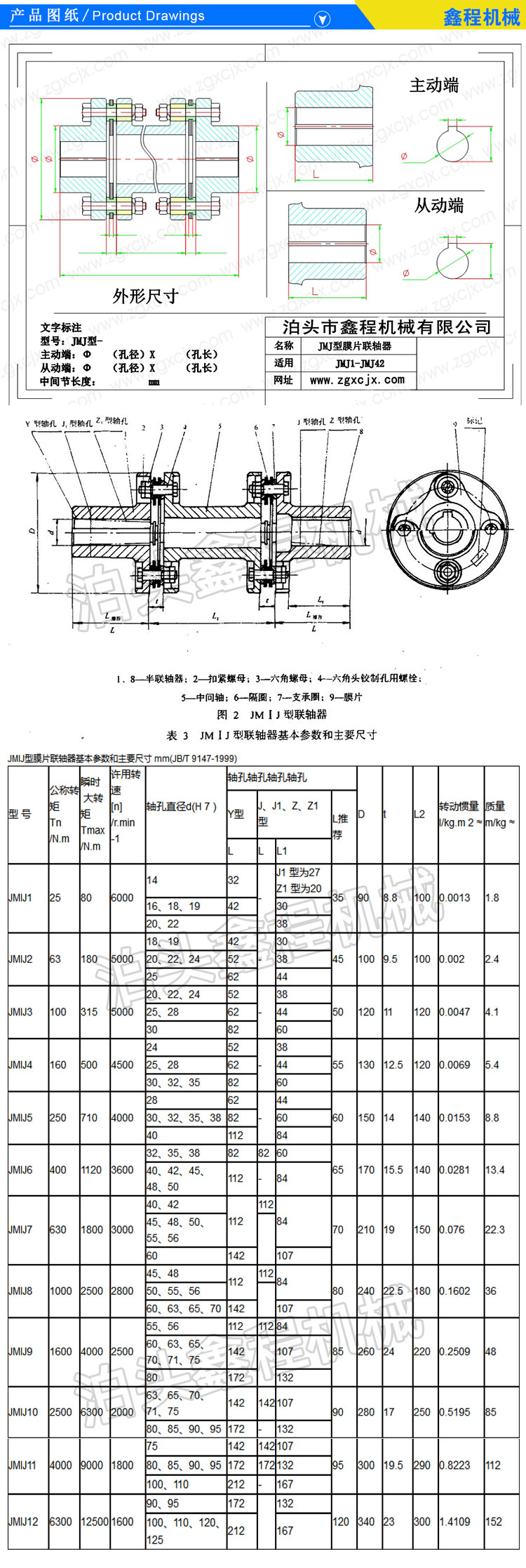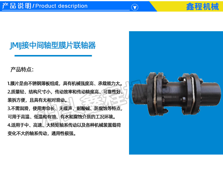 JMIJ中间轴膜片联轴器是提高两轴线偏移补偿性能。中间轴可以多采用焊接回火去应力,也可以锻件直接加工,膜片可以采用圆形梅花方形多边形,发黑处理。中间轴一般为普通车床加工,半联轴器为数控车床加工,铰制孔螺丝孔由数控铣加工而成可互换。
