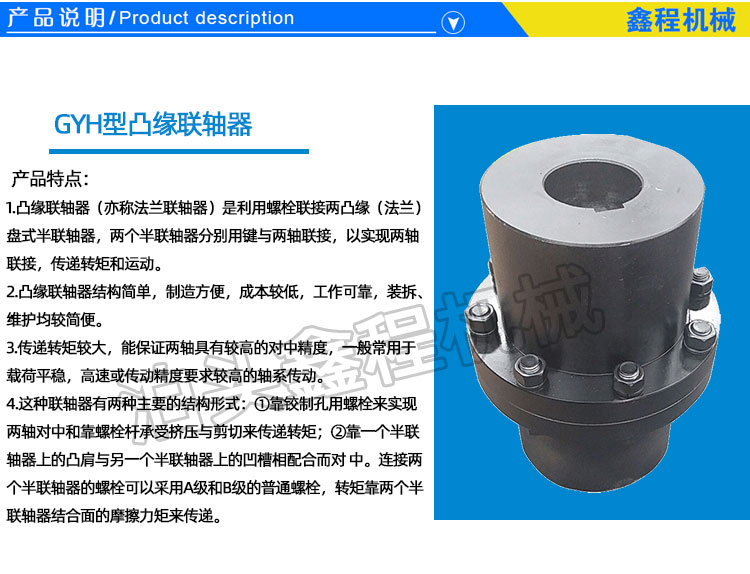 GY凸缘联轴器由于结构简单、成本低、可传递较大转矩,故当转速低、无冲击、轴的刚性大、对中性较好时常采用。