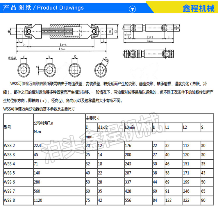 WSS为小型万向联轴器有单节,可按用户要求生产,广泛应用于矿山、包装、印刷、造纸、冶金、自动化、风机、食品、破碎机等各个机械制造行业。