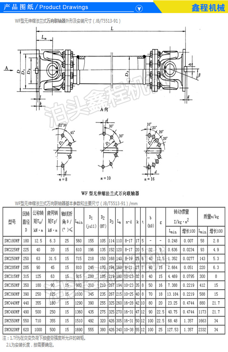 万向联轴器由于其偏差角度大,传递扭矩高等特点,被广泛应用于各类通用机械场合.万向联轴器适用于联结空间同一平面上两轴轴线夹角β≤45o的传动场合,传递公称转矩11.2-1120N.m.WSD型为单十字万向联轴器,WS型为双十字万向联轴器每节大轴间夹角45o.成品孔H7,可根据要求,开键槽,六方孔和四方孔.允许两轴间夹角在限定的范围内随工作需要而改变.对两轴的操作要按照技术数据为依靠,把握好正确处理偏差问题。