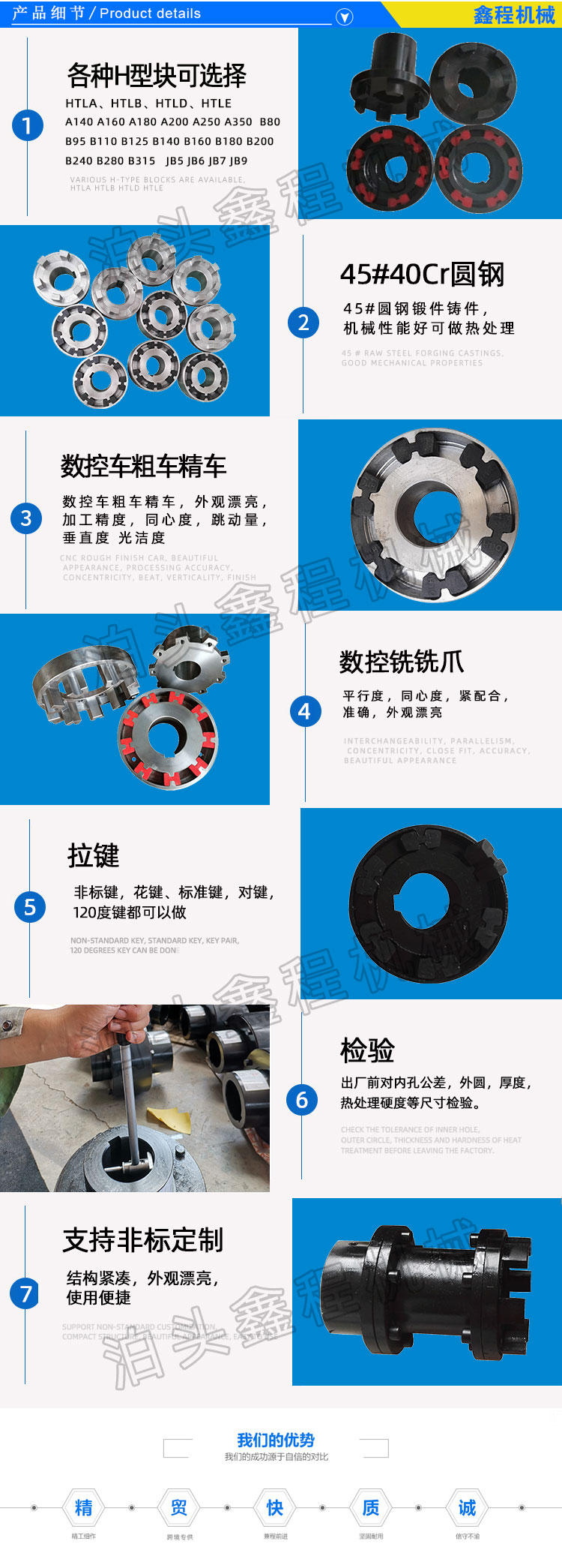 每件联轴器完成后,我们都要对联轴器进行质检,保护出厂质量。先对照图纸查看联轴器定形尺度精度,如外形、孔、轴直径,再查看定位尺度,如边距、中 心距等。当查看形状杂乱、尺度繁复的零件时,查看前应先画一个表格,先把定形尺度列入表内,再把定位尺度列入表内,然后按表的次序丈量,并将丈量成果写入实测尺度一栏内,这么既不会遗失尺度,又能确认查看质量。