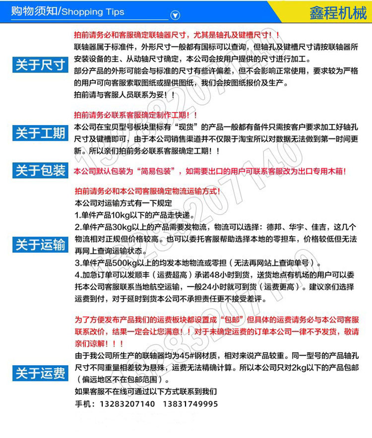 联轴器的制作材质主要有铸铁,铸钢,锻钢,铝合金,铬等,材质的好与次可以说决定联轴器的性能及使用寿命.联轴器一般选用铸钢或者铸铁,锻钢等,我公司生产的联轴器多采用45#钢的铸件或者锻件,要根据客户的要求来定材质。锻件的机械性能一般优于同样材料的铸件。锻造是机械制造中常用的成形方法,通过锻造能取消金属的铸态疏松、焊合孔洞。机械中负载高、工作条件严峻的重要零件,除形状较简单的可用轧制的板材、型材,多采用锻件。根据这些也就说明材质不同决定着成型以后的联轴器的性能和使用寿命也会不同,所以在订制联轴器时,请您说明您想要的联轴器的材质,我们将以您的要求做。