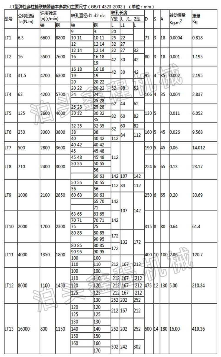 LT(原TL型)弹性套柱销联轴器是利用一端套有弹性套(橡胶材料)的柱销,装在两半联轴器凸缘孔中,以实现两半联轴器的联接。结构比较简单,制造容易,不用润滑,不需要与金属硫化粘结,换弹性套方便,不用移动半联轴器,具有相应补偿两轴相对偏移和减振缓冲性能。弹性套工作是受压缩变形,由于弹性套的厚度较薄,体积小,弹性变形有限,所以,弹性套柱销联轴器虽可补偿轴线位移和弹性,但轴线位移许用补偿量较少,弹性较弱。
